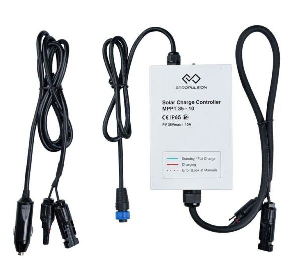 Spirit napelemes töltésvezérlő. Egy további 12 V-os töltődugó is tartozék. A Spirit akkumulátor működés közben is tölthető ezzel a töltésvezérlővel.