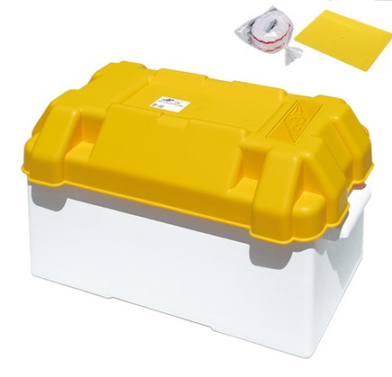 Ez a fehér és sárga akkumulátordoboz ideális megoldás az akkumulátorok biztonságos tárolására hajókban, lakókocsikban és ipari alkalmazásokban.