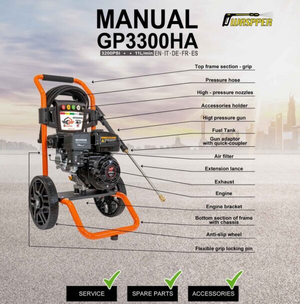 A GP3300HA alapfelszereltségként egy 10 méteres gumitömlővel és egy több nagynyomású fúvókából (0°, 15°, 25°, 40°) álló készlettel, valamint egy tisztítószeres fúvókával van felszerelve, amely lehetővé teszi a tisztítás különböző igényekhez igazítását. Az ergonomikus pisztoly kiváló minőségű acél toldattal kényelmes kezelést biztosít. A robusztus és könnyű acélvázas szerkezet könnyen mozgatható. Rendszeres karbantartással évekig problémamentes működést biztosít. A széleskörű tartozékválaszték tovább növeli a sokoldalúságát.