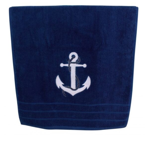 A törölköző elegáns sötétkék színű, precíz fehér horgonyhímzéssel kiegészítve. Ez az ikonikus szimbólum autentikus tengerészeti bájt kölcsönöz a törölközőnek, és stílusos, praktikus kiegészítője lehet bármely fürdőszobának vagy strandnak.