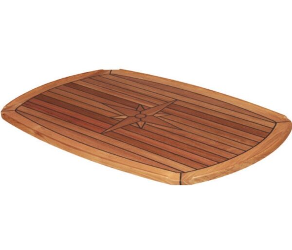 A teakfa környezetbarát, államilag ellenőrzött indonéz ültetvényekről származik, ami garantálja a kiváló minőséget és a felelősségteljes eredetet. A deszka közepét részletes tengeri csillag motívum díszíti. Az alap epoxigyantával kezelt rétegelt lemezből készült, a felületén 4 mm vastag teakfa csíkok találhatók, amelyeket tartós fekete tömítőanyaggal kötnek össze. Ez a konstrukció kivételes ellenállást biztosít a nedvességgel és a kopással szemben, így a deszka sokéves használatra van hivatott még nehéz körülmények között is.