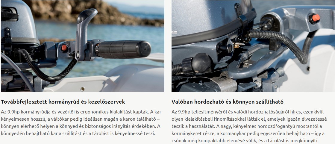 A hagyományos 9,9 lóerős motorokhoz képest nagyobb lökettérfogatának köszönhetően ez a modell jobb gyorsulást, nagyobb nyomatékot és jobb tapadást kínál még teljesen megrakott hajó esetén is. Ideális felfújható csónakokhoz, alumínium és üvegszálas csónakokhoz, de horgászok vagy kölcsönző cégek számára is munkamotorként.