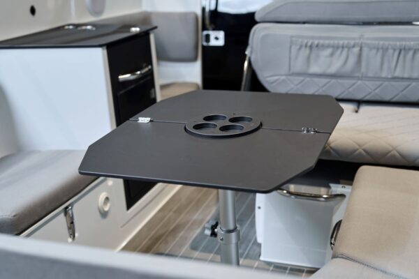 A világos, nagy ablakos kabin háló- és tárolóhelyet kínál, opcionális WC-vel. A nyitott tér U-alakú kanapéval és forgó vezetőüléssel hét fő számára teremt társasági környezetet, opcionális asztallal/napozóággyal. A Premium Edition csomag hűtőszekrényt, nyomás alatti vizet és tűzhelyet is tartalmaz.