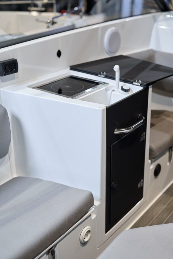 A fedélzeten való mozgást lapos orr, ergonomikus lépcsők és úszóplatformok biztosítják. A prémium csomag vízisí ívet is tartalmaz. A vezetőülés Yamarin Q kijelzővel rendelkezik. Fekete részletekkel, sötétített ablakokkal és teak/Flexiteek fedélzettel ellátott dizájn.